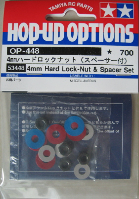 Tamiya 4mm Hard Lock-Nut & Spacer Set #53448 These nuts prevent screws from becoming loose. Also come with spacers to adjust wheel offset.New in original Tamiya package.