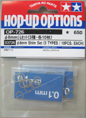 Tamiya Diameter 6mm Shim Set (3 Types / 10pcs each) #53726Shims can be used to adjust the clearance of diameter 6mm shaft. Contains 10 pieces each of 0.1mm, 0.2mm and 0.3mm thickness.New in original Tamiya package.